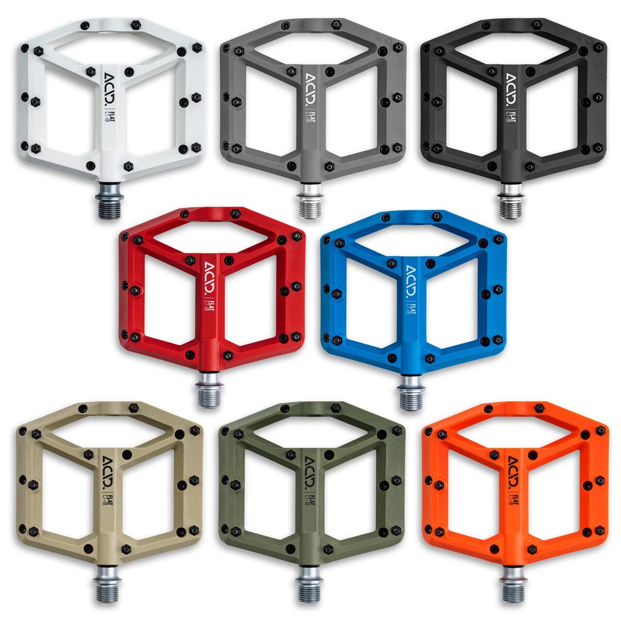 I know every berm, jump, rock and tree root of this bike park. It's one massive adrenaline rush! And I can count on my ACID FLAT pedals 100%. With their adjustable pins and large platform, I feel glued to the bike even on the gnarliest of root sections – yet I can still dab in a flash if things start to get a bit too loose. light flat pedal; nylon-reinforced composite body and CrMo axle; chamfered edges for improved cornering clearance; large contact surface; ultra low-profile design; nine replaceable and adjustable anti-slip pins per side; sealed cartridge bearings size (LxWxH) 115 x 100 x 19 mm material plastic weight 330 g